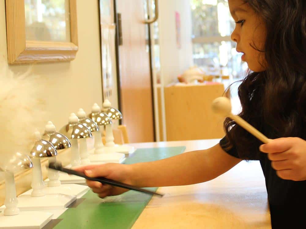 - Observing carefully, with all senses. In contrast to computer screens, which are two-dimensional and primarily visual, the sensorial activities heighten observation skills by training all of a child’s senses. Children listen to differences in sound made by shaking cylinders to match, or tones in the scale made by the Montessori Musical Bells. Blindfolded, they match wooden tablets by their weight; other tablets by their heat conductivity or roughness of texture. They match taste and smell bottles; they arrange rods by lengths and cubes by volume. They put together complex, three-dimensional puzzles by using multiple sense modalities in conjunction. Why does this matter? In addition to the fact that many professions, from cooks to research scientists, need finely-tuned senses, deliberate, sequenced observational training helps children become active observers of their environment. And of course, the world is a much more enjoyable place when we have the tools to notice and appreciate the beauty around us!