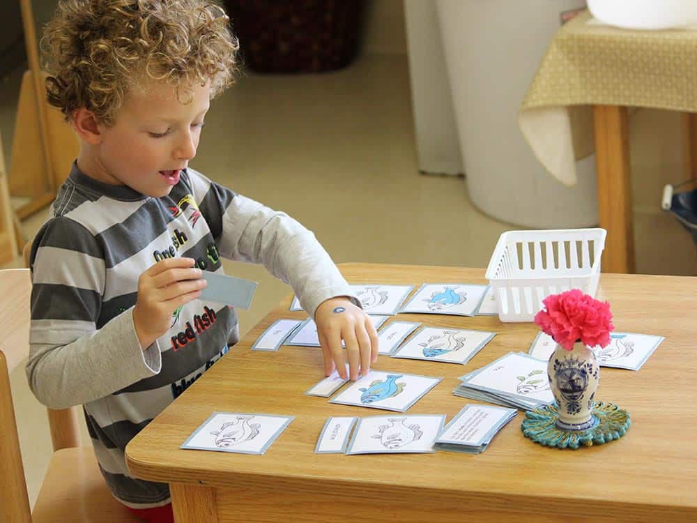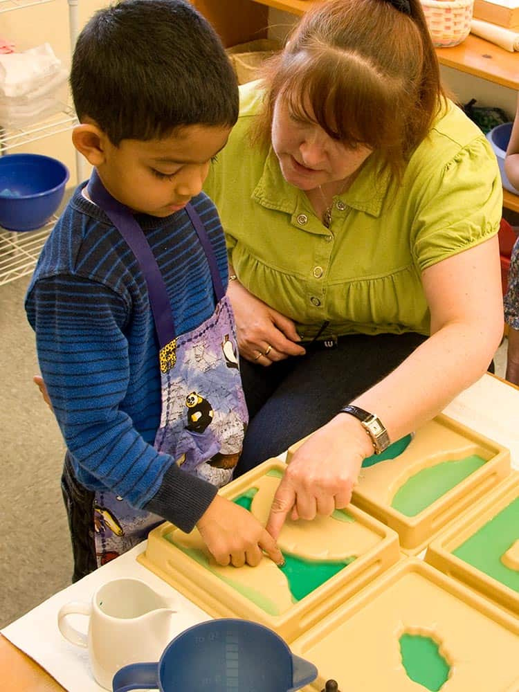 As part of the sensorial exercises, we expose children to a range of scientific vocabulary: they are introduced to the names of different forms of leafs (palmate, acicular) as they trace and match them; they identify land and water forms (peninsula, archipelago) as they work with water and clay to make these features in miniature; they make maps of the world, and learn the names of countries and states; they learn the names of two-dimensional geometric shapes and three-dimensional geometric solids (triangular pyramid, rectangular prism). The primary value here is not even the specific terms that the child retains, but the fact that she develops an inner norm for what it feels like to use vocabulary to heighten and capture one’s observations. Language itself becomes a precision tool to classify and categorize the world one perceives, rather than just a series of vague impressions.