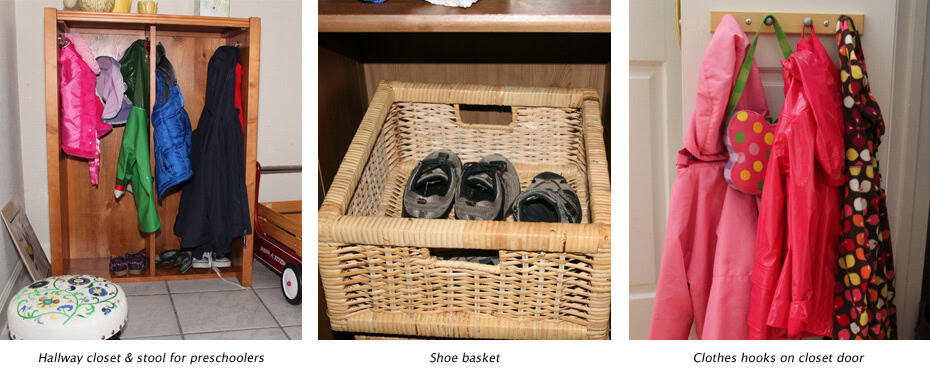 - Provide simple storage spots for belongings right inside the front door. A small rug to place shoes or a basket to put them into and some hooks to hang jackets are a great start. This can help your child get out of the house and back in more independently, and maybe prevent some meltdowns! A little stool to sit on helps, as well.