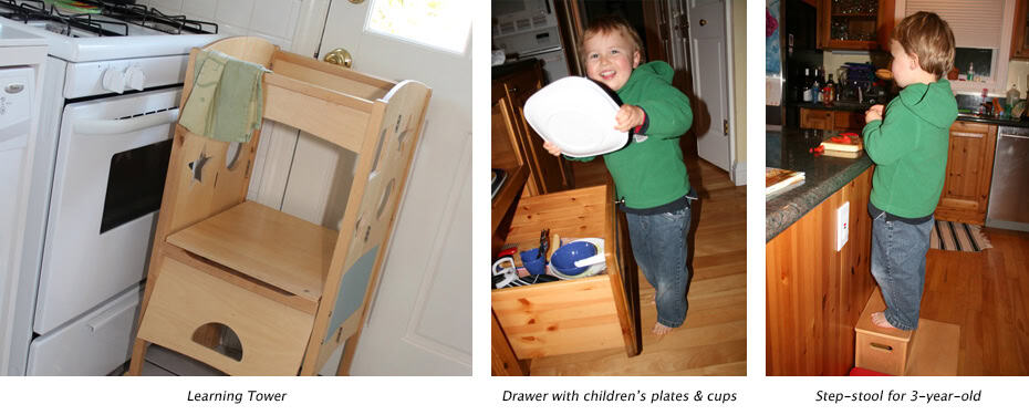 - Make your kitchen accessible to your child. Find a low shelf or drawer to store cups, placemats, and utensils within your child’s reach. Buy glass cups and inexpensive ceramic plates (IKEA is great!) that you don’t mind getting broken. Invite your child to set his own place at the table. A bigger step stool, or a learning tower can be a great help to little people who want to join you in the fun cooking activities at counter height. And, of course, when it comes time to sit down and eat, encourage your child to feed himself: Even young toddlers can eat finger-foods on their own, and start using a spoon; this is what they do in their Montessori classrooms, too.