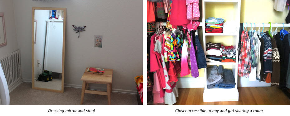 - Facilitate getting dressed independently. Low open shelves, low racks, a mirror and a bench with brush or comb can enable even 2- or 3-year-olds to begin to dress independently, especially if you pre-select an outfit the night before, or lay out two simple choices for a younger child.